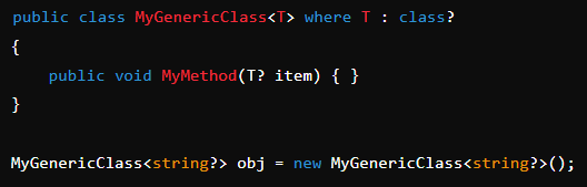 형식 매개변수 'T'가 null을 허용하거나 null을 허용하지 않는 참조 형식이어야 함을 의미한다. 이 제약 조건은 nullable 참조형식에 적용할 수 있다.