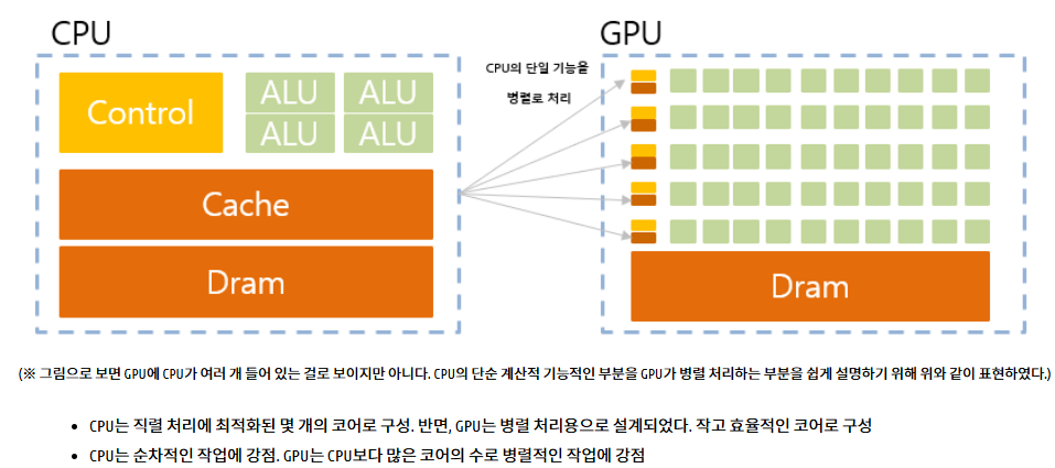 병렬 처리: 많은 코어로 구성되어 동시에 많은 연산을 병렬로 처리